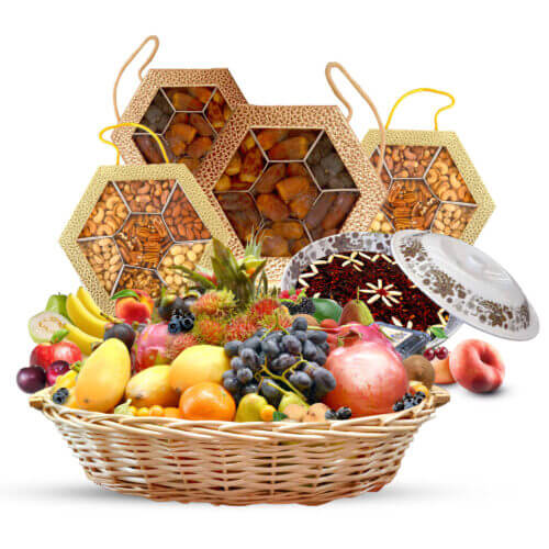 سلة فواكه - حلوى عمانية بالعسل والزعفران - صندوقين مكسرات مشكلة - صندوقين تمور سعودية