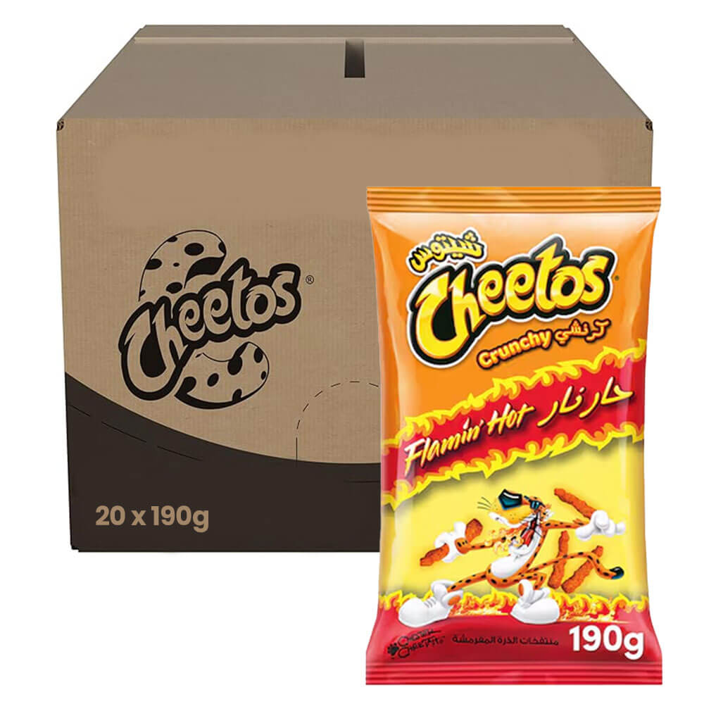 Order bulk Cheetos Chips Flamin-Hot 20x190g from Martoo wholesale. The best market with the highest quality products and great deals. Cheetos Flamin' Hot chips are a delicious and spicy snack. Combines the bold and fiery taste of Flamin' Hot seasoning with the crispy texture of a cheese-flavored chip. Coated in a spicy red seasoning with high-quality corn to gives them bold and fiery flavor. Combination of hot-seasoning and other spices that gives a nice balance of heat and flavor. These chips come in a convenient and resealable bag, making them perfect for sharing or for snacking on the go. Cheetos Chips Flamin-Hot 20x190g are a favorite among chip lovers who enjoy a spicy and bold taste. These chips are perfect for anyone looking for a satisfying and spicy snack that has a bold and fiery flavor. Check our Martoo wholesale for more Chips and earn more points for every order! Martoo wholesale is one of big supplier for food products.